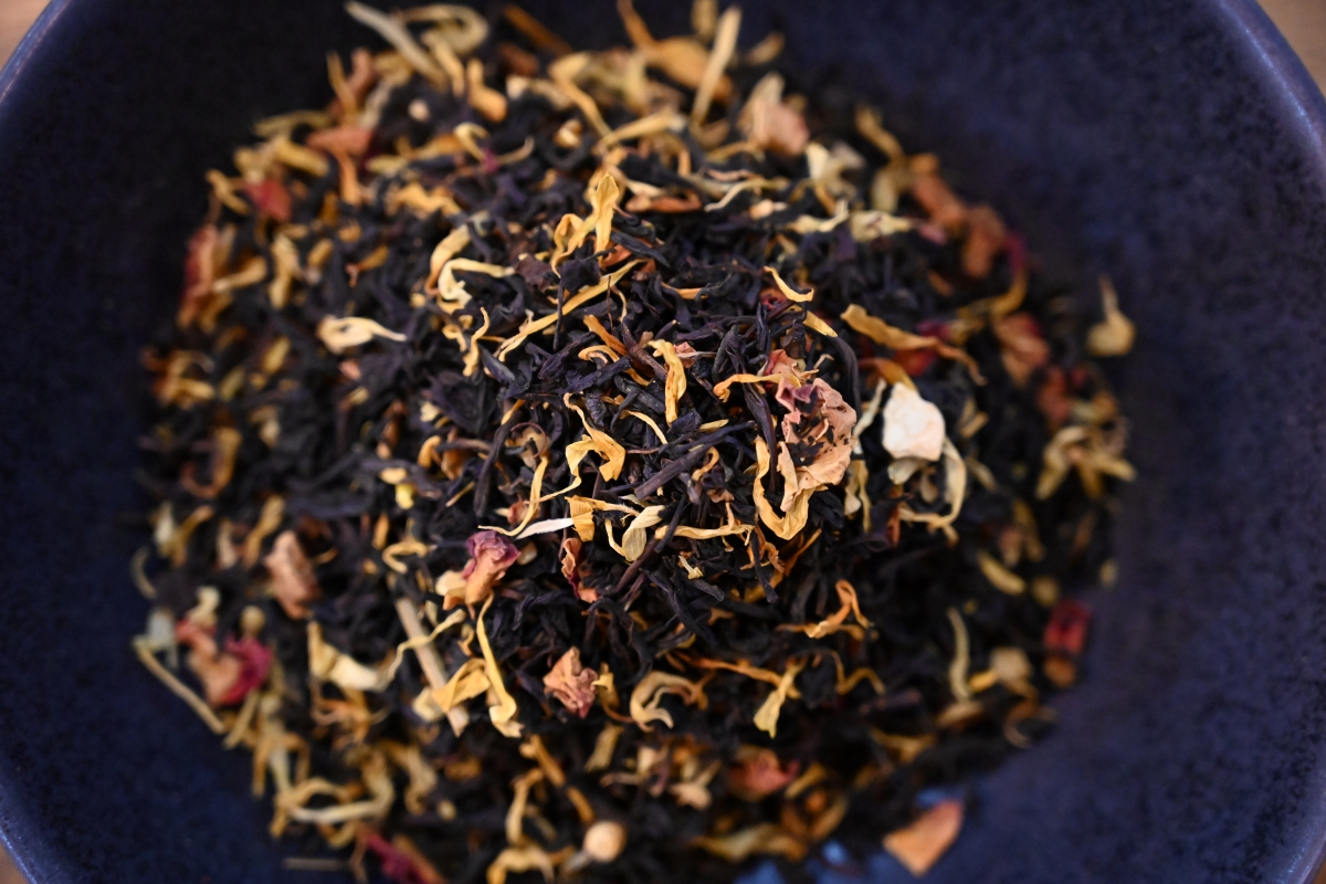 Unser Weihnachtstee vereint den feinen China-Ceylon-Blend mit den wärmenden Noten von weihnachtlichen Gewürzen, süßen Apfel- und Orangenstücken sowie einer Spur von Zimt, dekoriert mit den zarten Blüten von Ringelblumen, Rosenblütenblättern und knusprigen Mandeln.